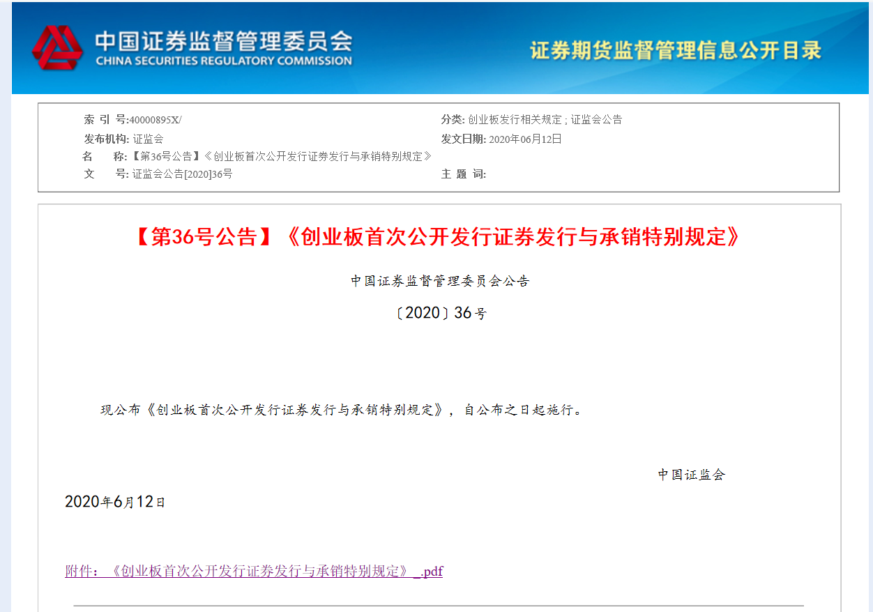 【第36号公告】《创业板首次公开发行证券发行与承销特别规定》