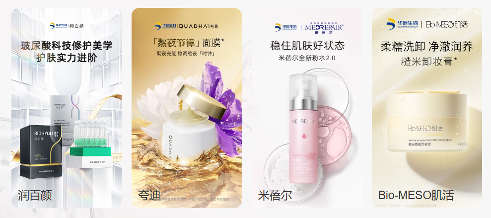 在功能性护肤品方面,华熙生物依托底层技术不断推出好产品,已打造出故宫口红、润百颜玻尿酸次抛精华等多款爆品及明星产品,并打造了“润百颜”、“夸迪”、“米蓓尔”、“BM肌活”四大品牌。四大品牌根据不同受众不同护肤需求,精准锁定市场:润百颜专研玻尿酸科技护肤,主打“HA+X”的智慧配方理念;夸迪定位硬核抗老,主打冻龄抗初老市场;BM肌活专研发酵,致力成为“发酵护肤第一品牌”;米蓓尔专研敏感肌、分级护理。